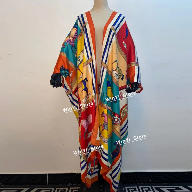 2021 WINYI new Cotton Bikini Sweet Lady Pink Boho Print Self Belted Front Open Long Kimono Dress Beach Tunic Women Wrap Dresses