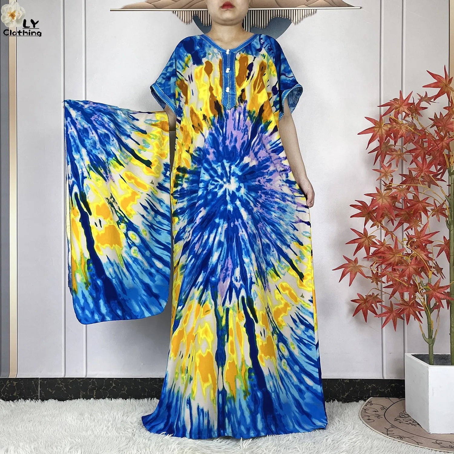 2024 New Style Short Sleeve African Dashiki Tie-dyed Cotton Abaya Caftan Lady Summer Maxi Islam Casual Dresses With Big Scarf