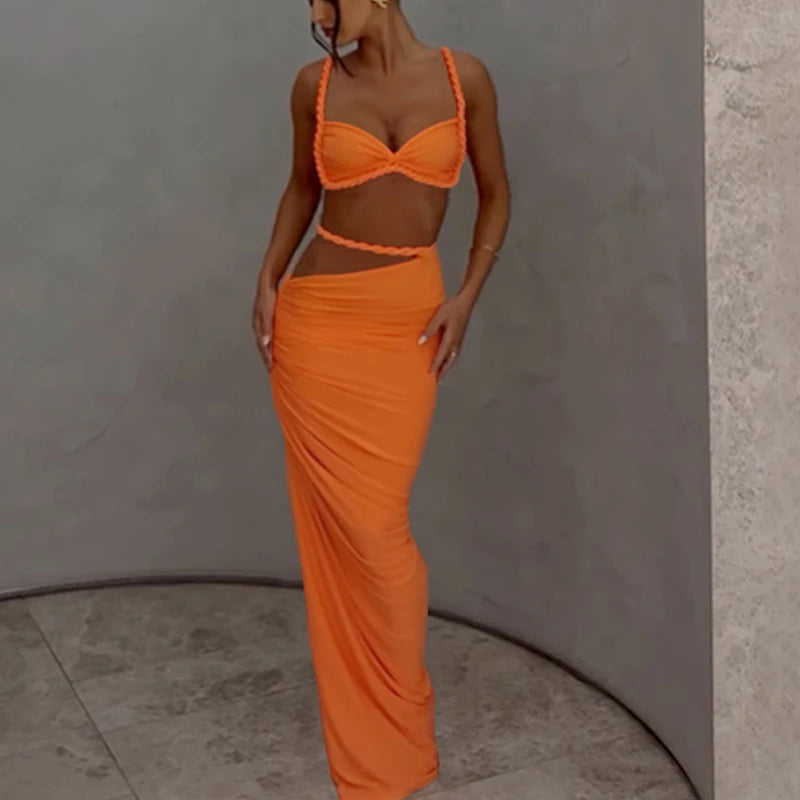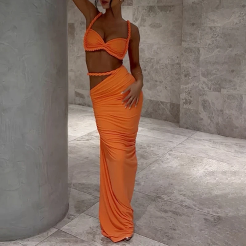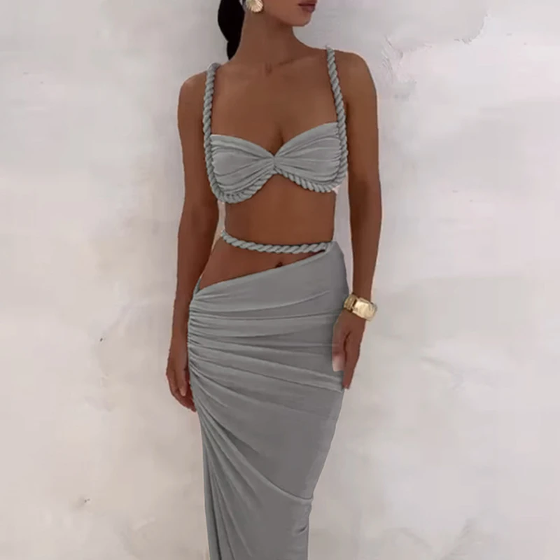 2025 Latest Women's 2-piece Sexiness Pretend Wrinkle Open Umbilical Tank Top+Shirt High Waist Long Dress Solid Color Set