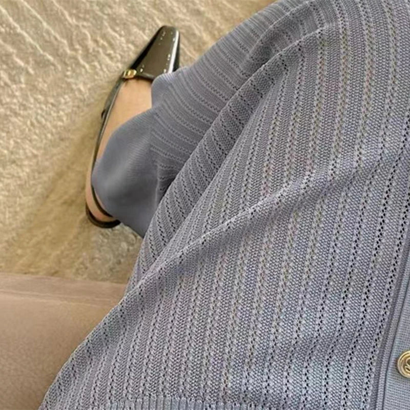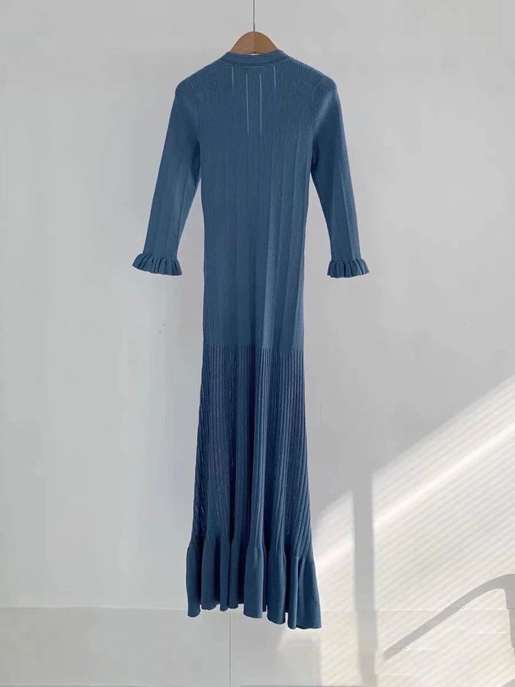 2025 New Blue Slim Knitted Long Dress Women's Round Neck Midi Sleeve Fashion Pleated Ruffled Hem Temperament Luxury Party Robe