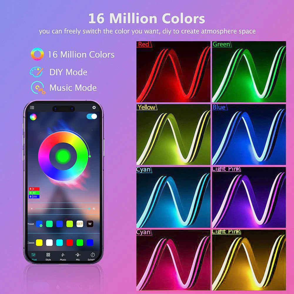 5M Silicone Neon LED Strip 24V Bluetooth RGB Music Sync IP67 Waterproof 72LEDs/M Rope Light for Home Party Decor