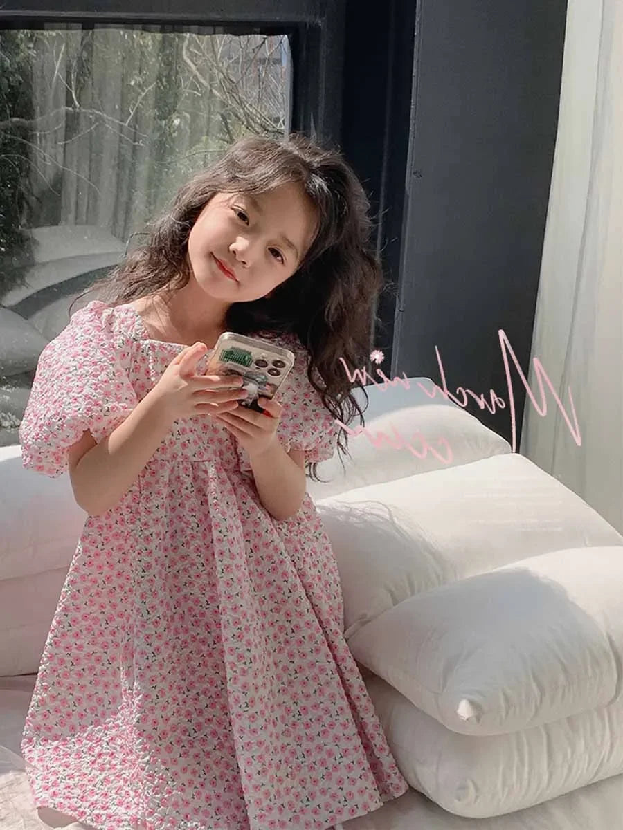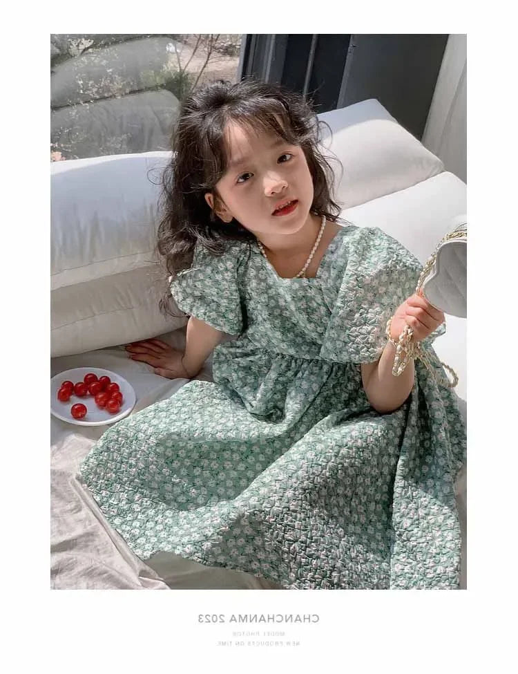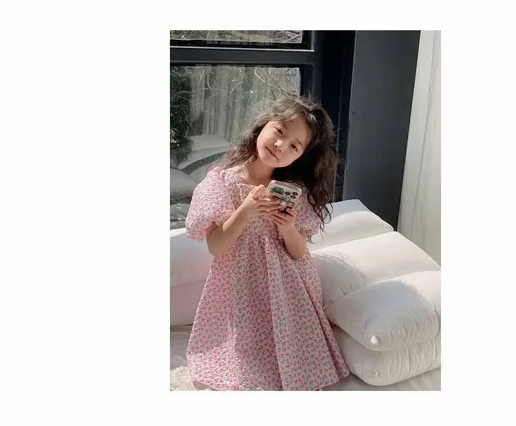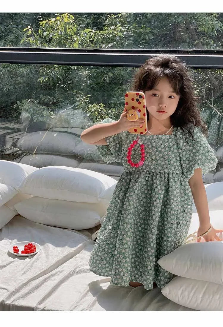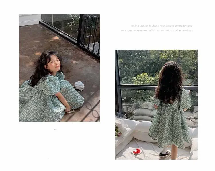 Girls Casual Dresses Floral Print Puffy Sleeves Dress Flower Girl Dresses Square Collar Clothes for Kids 3 To 7 Years