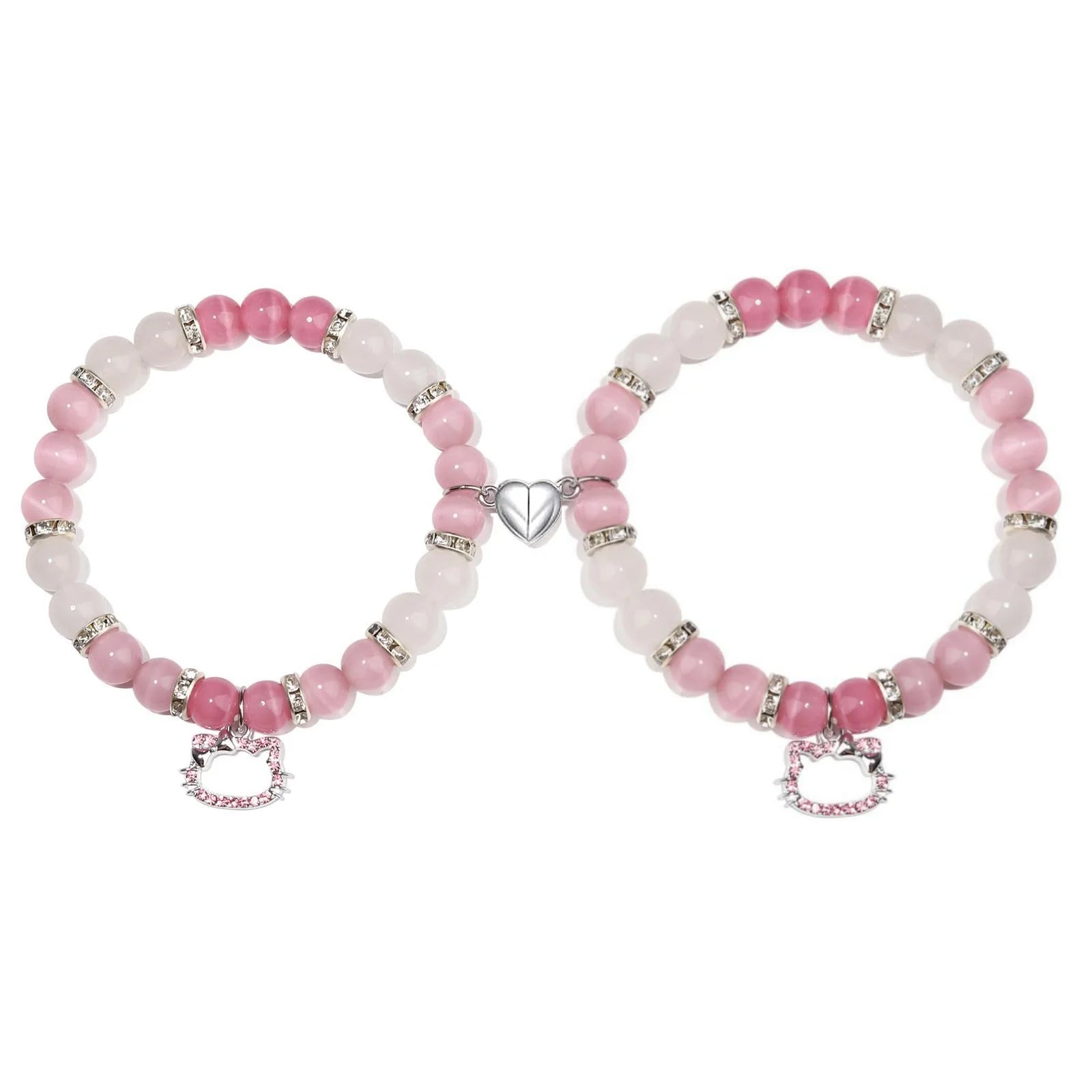 New 2Pcs/Set Crystal Hello Cat Beaded Bracelets for Lovers Heart Magnetic Matching Couple Bracelets Girls Festival Jewelry Gifts