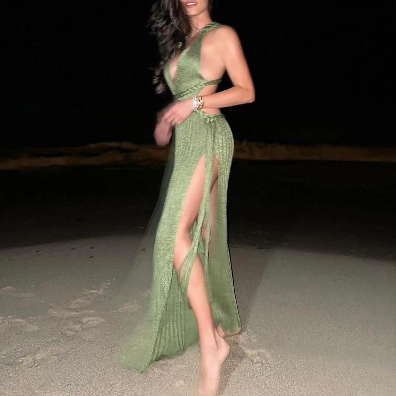 Sexy Hollow Out Sleeveless Knitted Long Dress Ladies 2025 V Neck Solid Slim Fit Summer Maxi Dress Elegant High Split Beach Dress