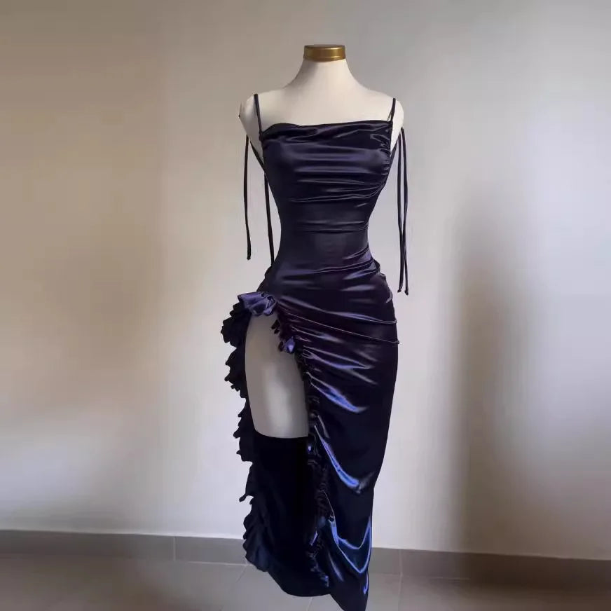 Sexy Satin Bodycon Long Dress Women Vintage Backless Strapless Ruffles Fork Party Club Elegant Evening Dresses Female Vestidos