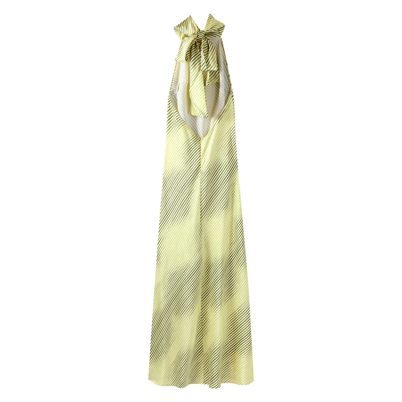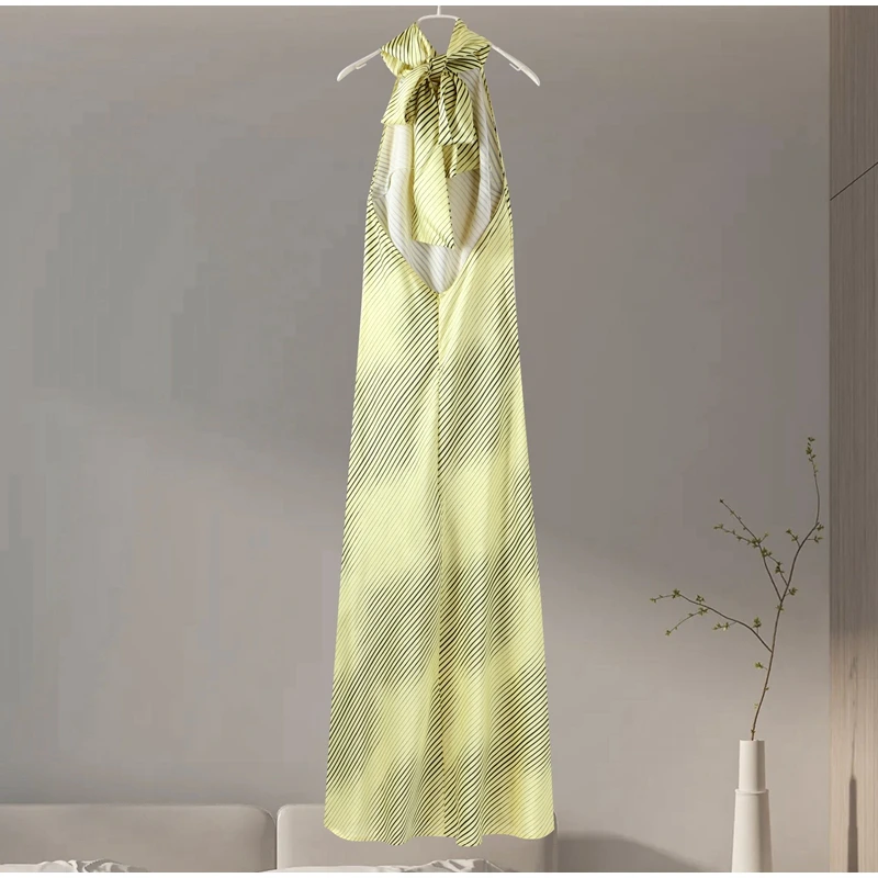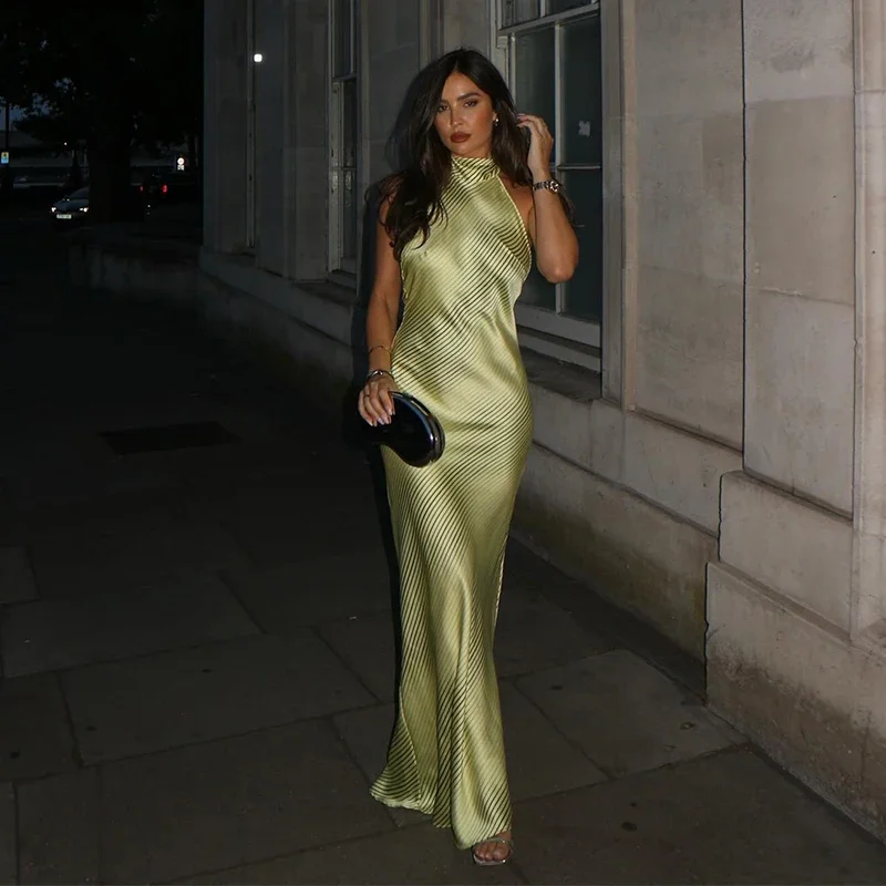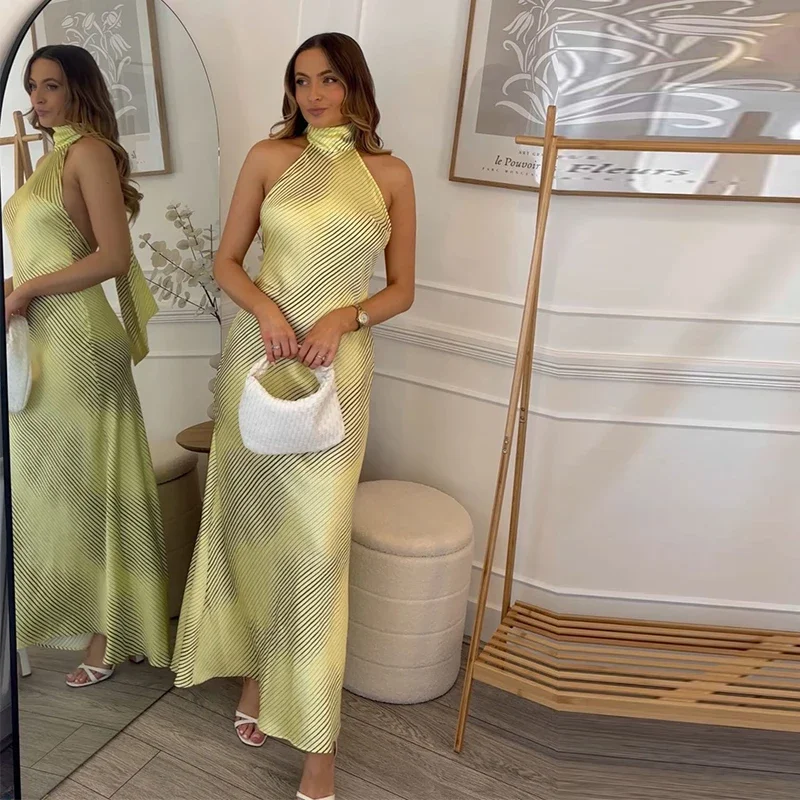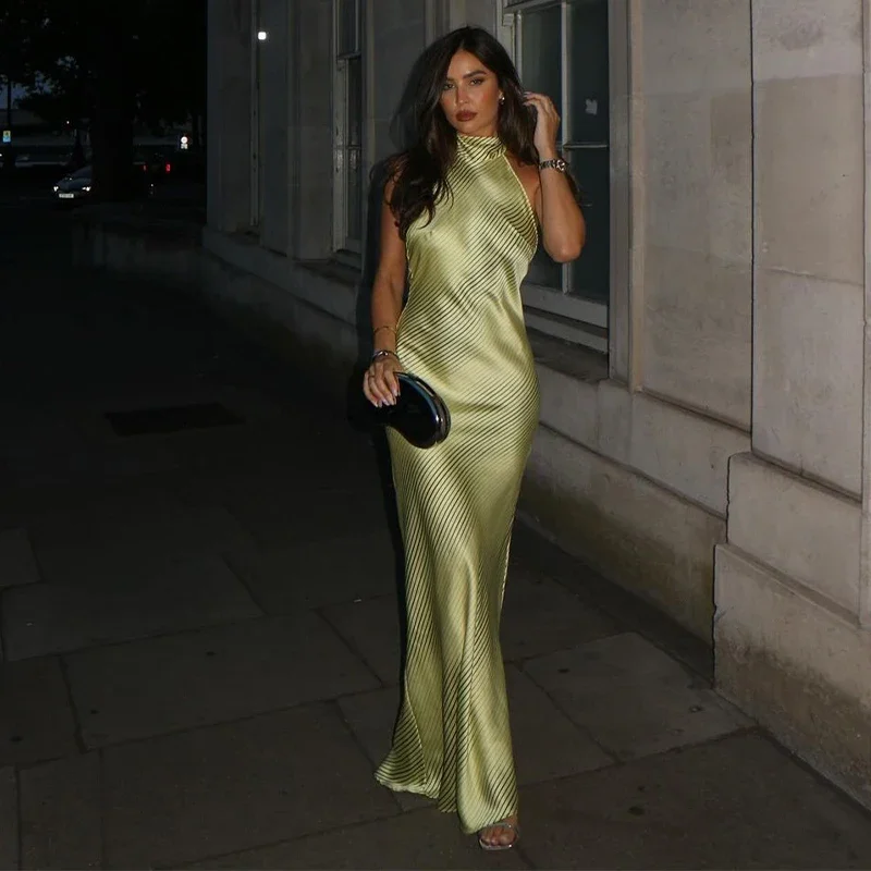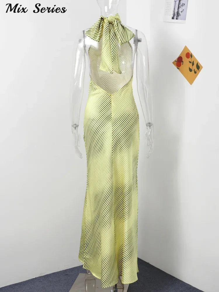 Sexy Striped Satin Halter Long Dress Women Elegant Backless Lace Up Party Dresses 2024 Autumn New Lady Slim Evening Vestidos