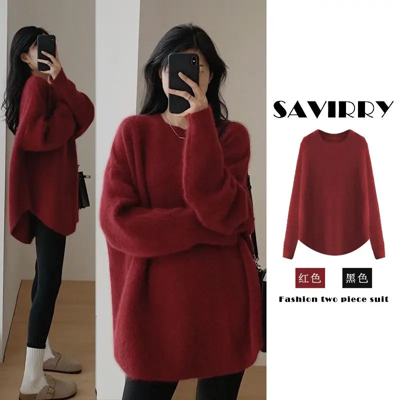 Women's Korean Fashion Simple Chic Oversized Knitted Sweater Solid O Neck Long Sleeve Pullover Tops Streetwear Irregular Jumpers